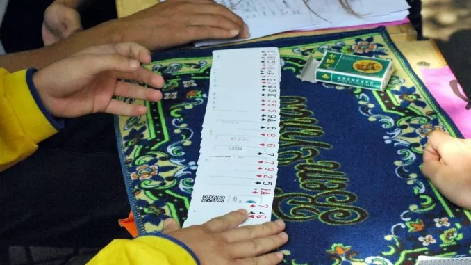 9. Während die Zuschauer noch voller Begeisterung sind, streicht das Kind über das Tuch, fühlt dabei die Münze und packt sie gleichzeitig.